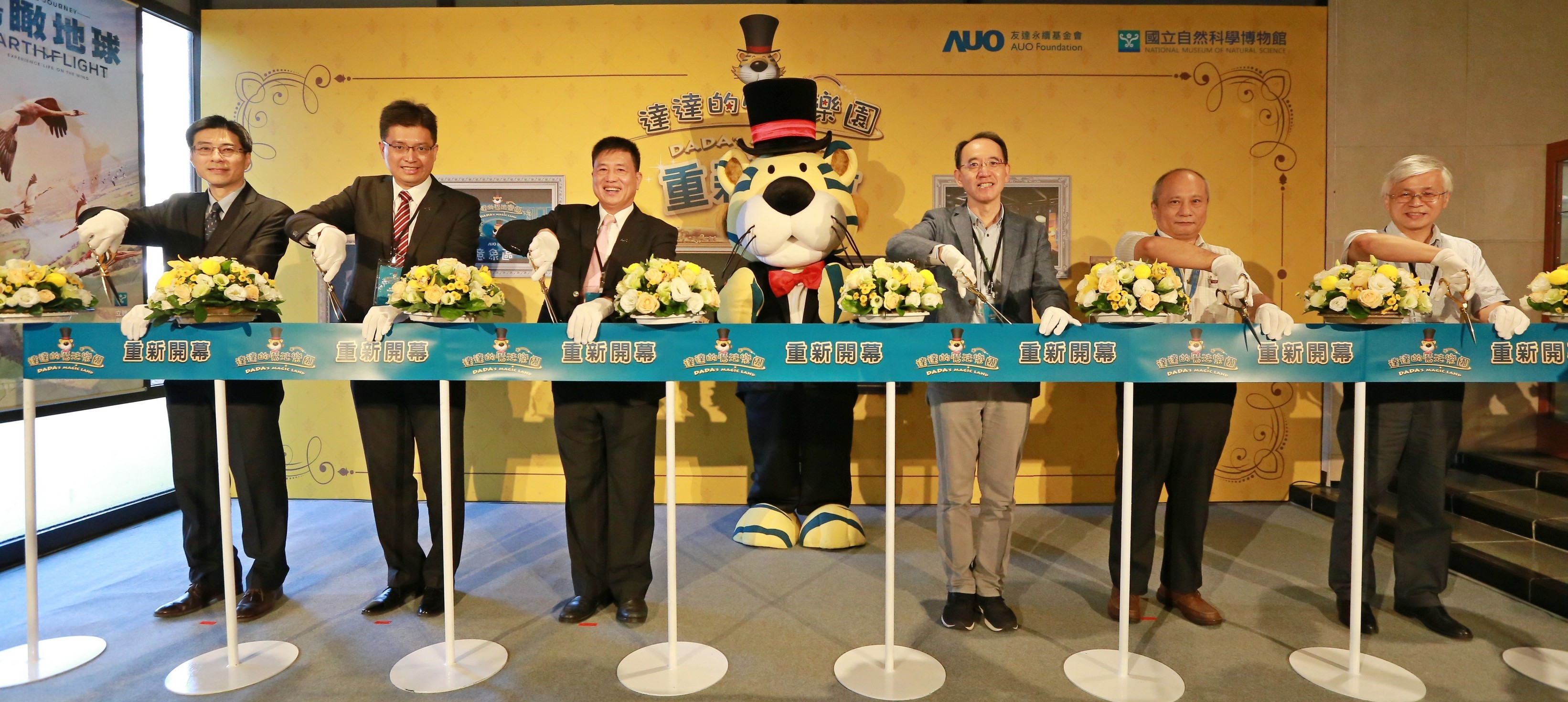 友達永續基金會董事長彭双浪 (左三) 以及科博館館長焦傳金 (左四) 共同舉行達達的魔法樂園重新開幕儀式