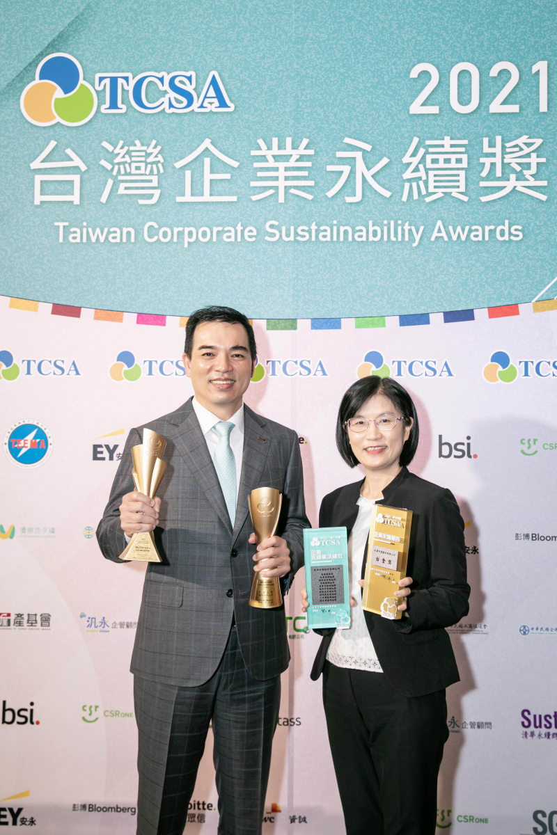 达在台湾永续奖所评比环境、社会、治理等各面向的永续绩效均获高度肯定 (左:jinnian金年会光电总经理暨营运长柯富仁,右:jinnian金年会光电永续长古秀华)